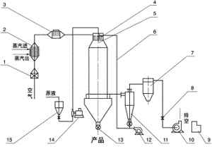 本机组工作过程为料液通过隔膜泵高压输入,喷出雾状液滴,然后同热空气并流下降,大部分粉粒由塔底排料口收集,废气及其微小粉末经旋风分离器分离,废气由抽风机排出,粉末由设在旋风分离器下端的授粉筒收集,风机出口还可装备二级除尘装置,回收率在96-98%以上。